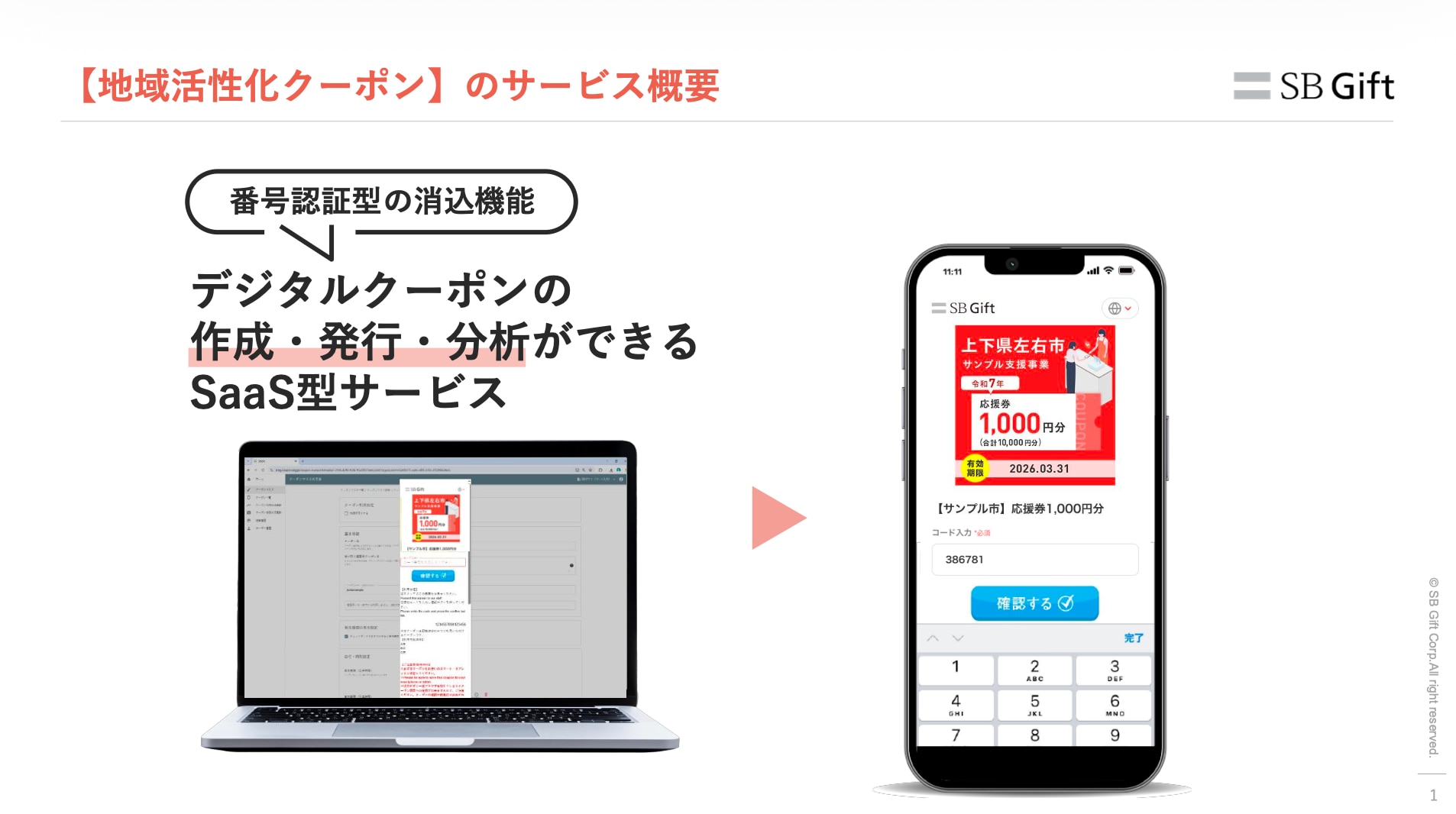 クーポンのデジタル化にあたってはSBギフトの地域活性化クーポン(自治体向けモバイルクーポンシステム)が採用されました。