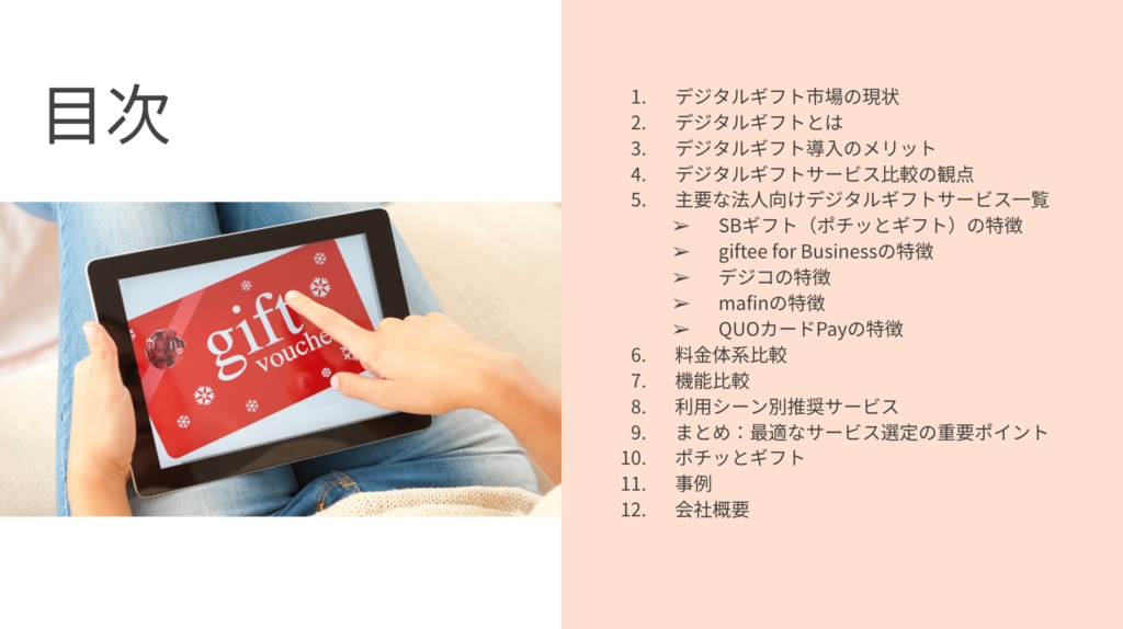 本資料は、主要デジタルギフトサービスの特徴・料金体系・実績の徹底比較しています。ぜひ、サービス選定にお役立てください。