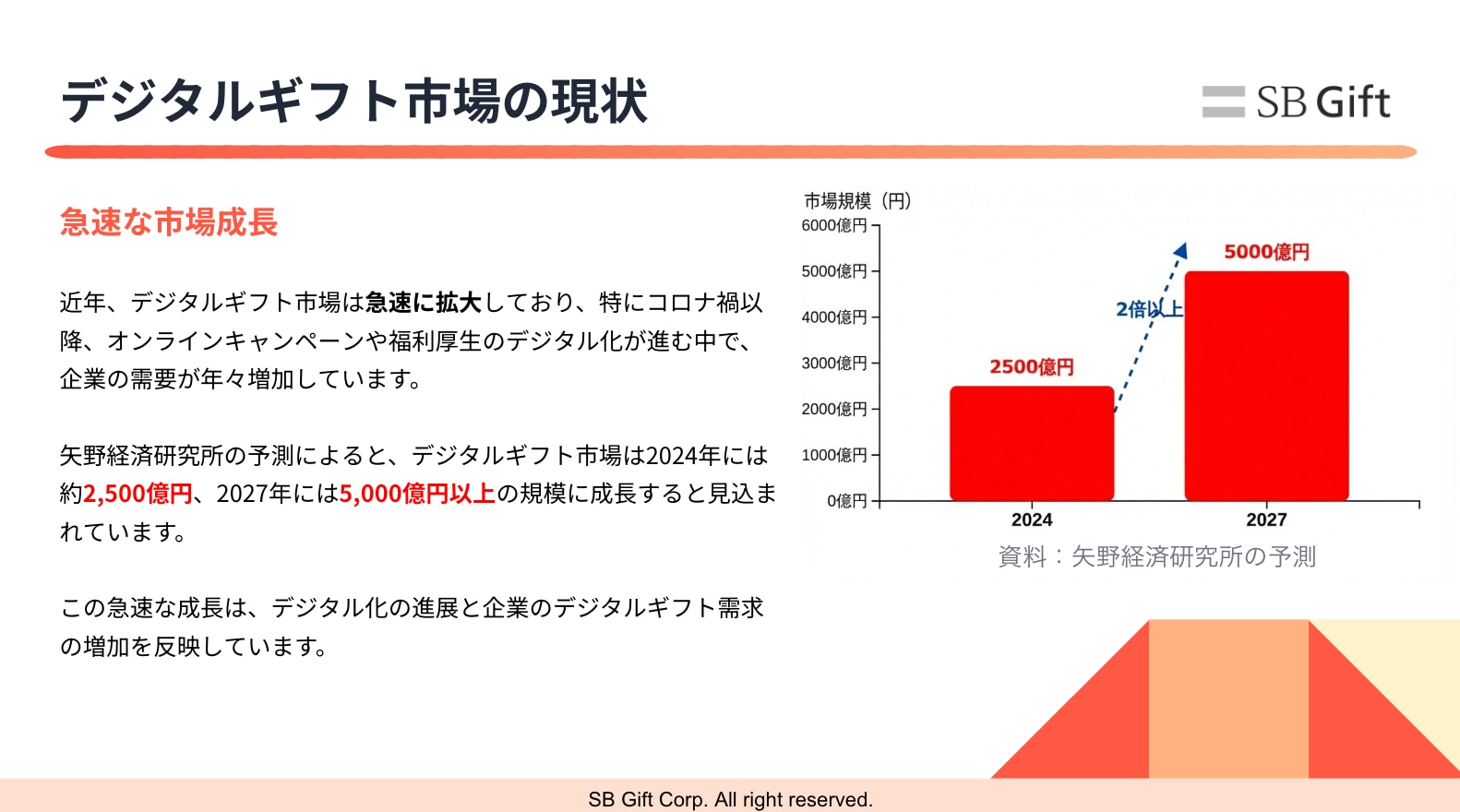 近年、デジタルギフト市場は急速に拡大しており、特にコロナ禍以降、オンラインキャンペーンや福利厚生のデジタル化が進む中で、企業の需要が年々増加しています。